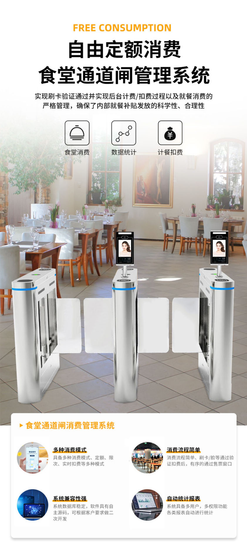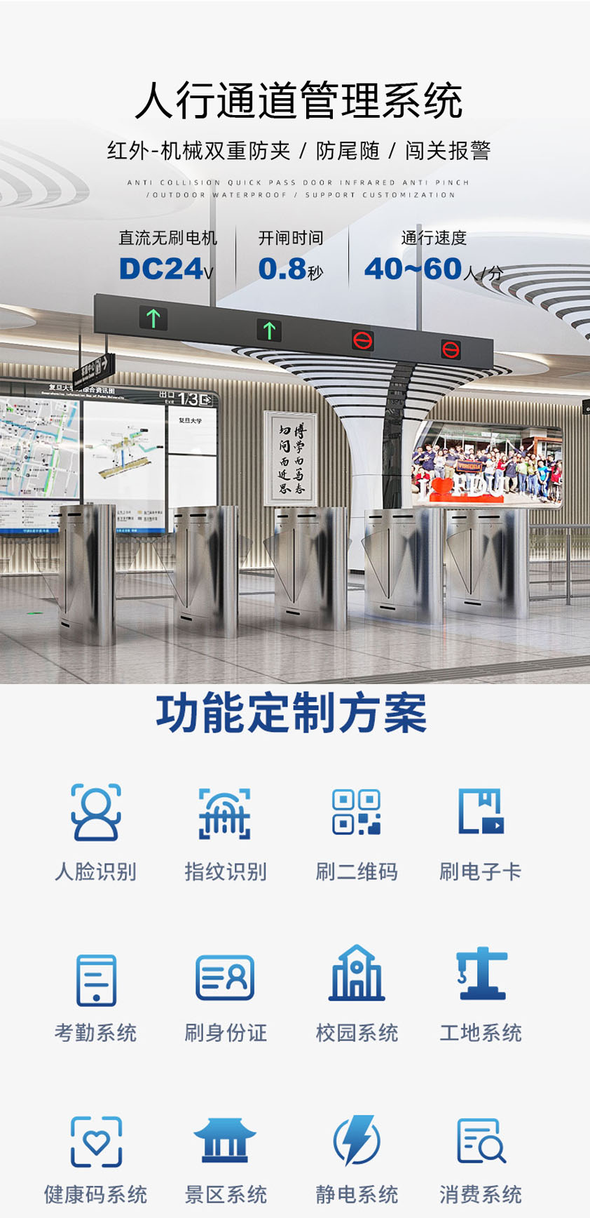 人行通道閘將機(jī)械、電子、微處理器控制及各種身份識(shí)別技術(shù)有機(jī)地融為一體,方便兼容CPU卡、IC卡、ID卡、條碼卡、指紋、人臉等讀卡識(shí)別設(shè)備的使用,通過(guò)選配DA身份識(shí)別系統(tǒng)設(shè)備和采用性能可靠的安全保護(hù)裝置、報(bào)警裝置、方向指示等,協(xié)調(diào)實(shí)現(xiàn)對(duì)通道智能化控制與管理等。