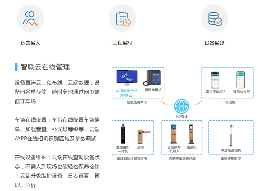 邦騰智聯(lián)云無人化停車收費(fèi)管理系統(tǒng)采用設(shè)備直連云技術(shù),將停車場的終端設(shè)備、進(jìn)出業(yè)務(wù)、車道監(jiān)控、異常處理、數(shù)據(jù)報(bào)表等集中至管理處值班室進(jìn)行管理,搭配移動(dòng)端APP應(yīng)用,值班人員可通過視頻對(duì)講,對(duì)車道事件進(jìn)行應(yīng)急處理等。打造了“前端有人或無人靈活值班管理,后端集中化少人管理,移動(dòng)端便捷管理”的無人化智能停車收費(fèi)管理新模式,讓項(xiàng)目交付更輕量化,實(shí)現(xiàn)停車場管理的全方位降本、提效、增收