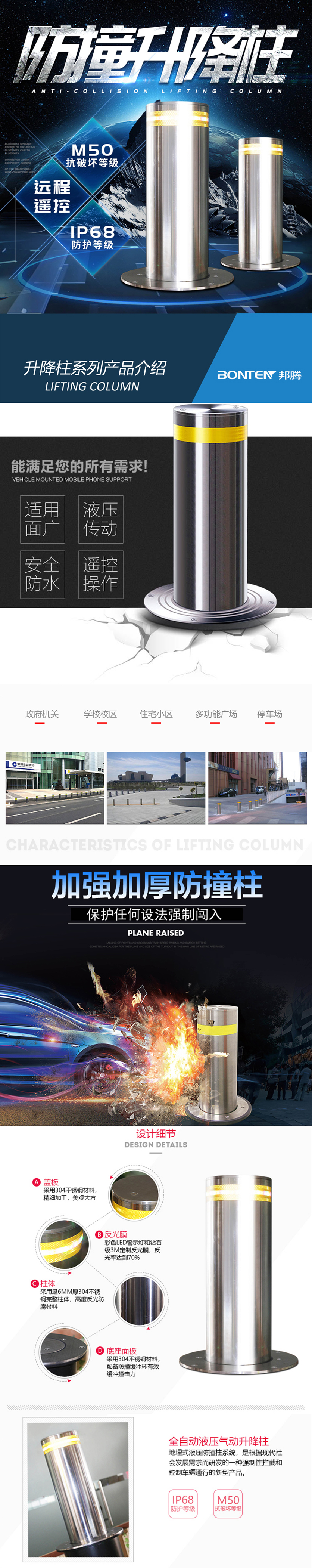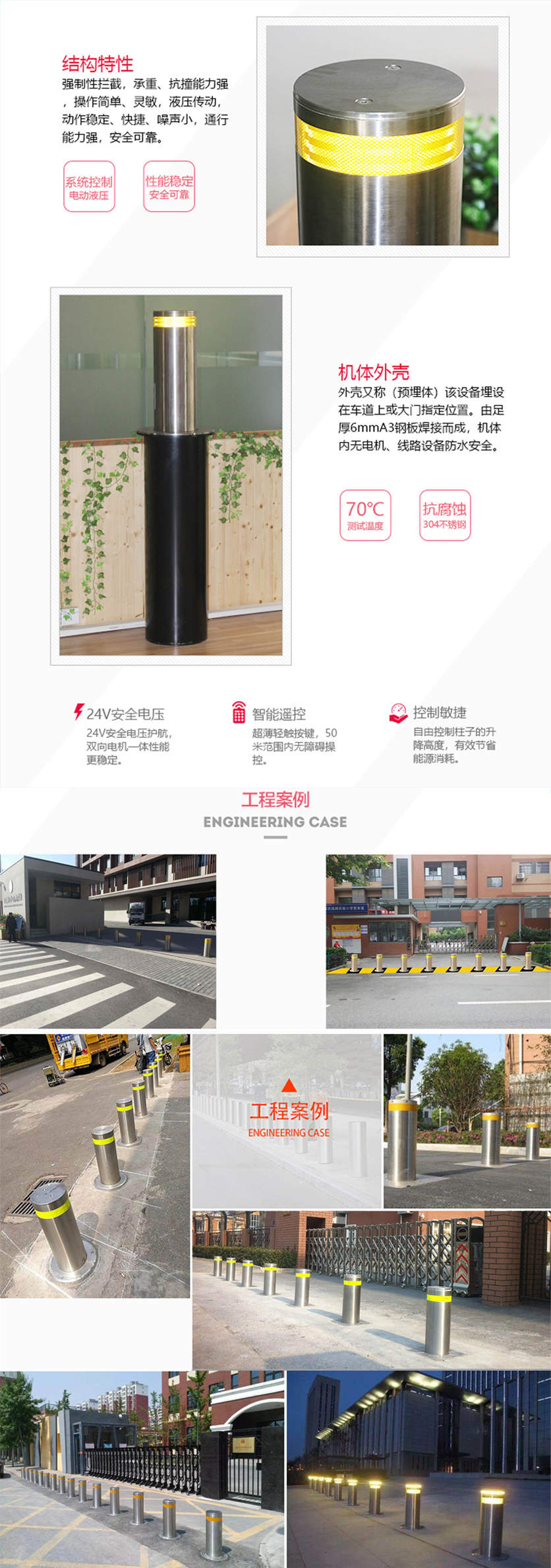 停車場升降柱廠家,升降柱產品技術參數(shù): 1、系統(tǒng)控制 :電動液壓 2、供電電源:220V/380V(控制電壓24V) 3、系統(tǒng)動力功率(w): 2.2KW 4、上升時間:3~5S(可調)。 5、下降時間:3~5S(可調)。 6、工作溫度:-35℃~75℃(適合)。 7、防護等級: 可達IP67 8、存儲環(huán)境:-10℃~65℃, 防雨防潮防塵。 9、顏色:多種顏色尺寸的反射貼膜 9、材質:304 不銹鋼、A3無縫鋼管。 10、升降柱規(guī)格(mm):長450×寬450×高820mm, 升降高度(mm):600mm(可按要求訂做400~800). 11、升降柱直徑(mm): 168/219/275mm,;升降柱體厚度(mm):6mm 12、重量(kg):100 kg左右 升降柱產品特點: 1、結構堅固耐用,承載負荷大,動作平穩(wěn),噪聲低。 2、采取PLC控制,系統(tǒng)運行性能穩(wěn)定可靠,便于集成。 3、路障機與道閘等其它設備進行聯(lián)動控制,也可以與其他控制設備組合,實現(xiàn)自動控制。 4、在停電的情況下或出現(xiàn)故障時,如路障機處于升起狀態(tài)需要下降時,可以通過手動操作將升起的路障機蓋板回落到水平位置以讓車輛通行。 5、采用國際領先的低壓液壓驅動技術,整個系統(tǒng)安全性高,可靠穩(wěn)定。 6、遙控裝置:通過無線遙控的方式,可在控制器周圍100米左右范圍內(根據現(xiàn)場的無線電通訊環(huán)境而定),活動遙控路障的升降。 7、根據用戶要求可加裝以下功能: A、刷卡控制:加裝刷卡器,可通過刷卡自動控制路障的升降。 B、道閘與路障聯(lián)動:配加道閘(擋車器)/門禁控制,可實現(xiàn)道閘、及門禁與路障聯(lián)動。 C、與電腦管埋系統(tǒng)或收費系統(tǒng)駁接:可連接管埋系統(tǒng)和收費系統(tǒng),有電腦統(tǒng)一控制。 |